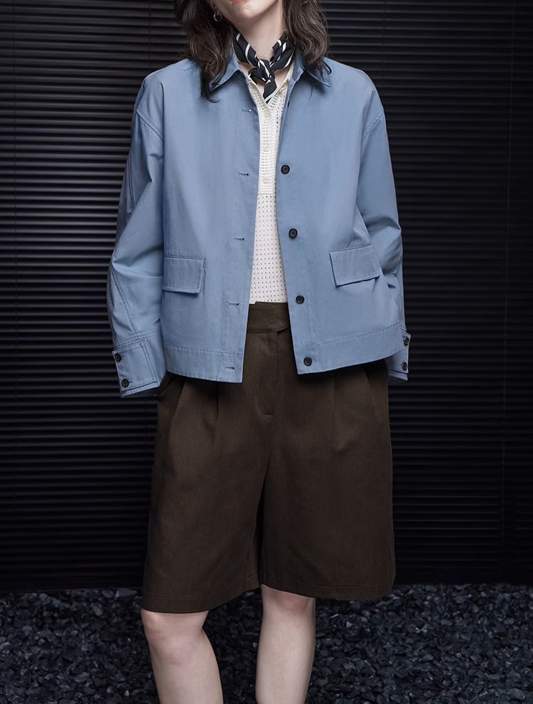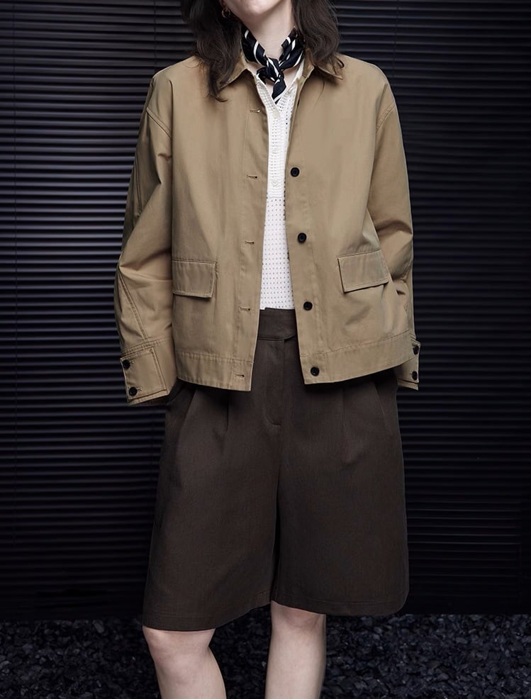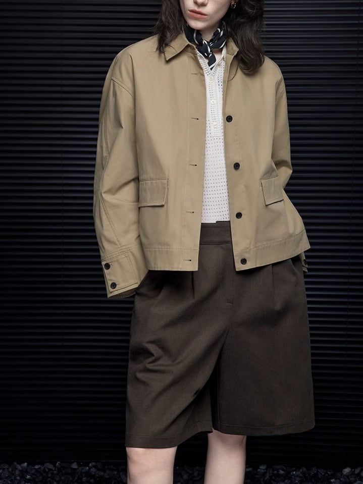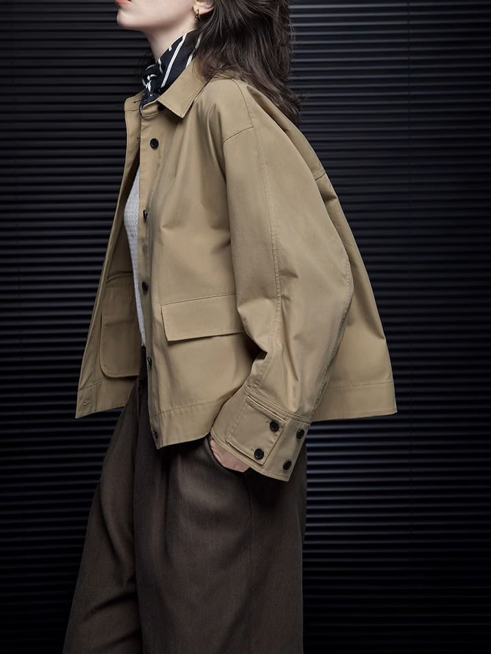 カジュアルでありながら高級感あるデザインが魅力の短いオーバーコートです。ゆったりとしたシルエットは、あらゆるスタイルにフィットし、デイリーユースに最適です。カーキ色の落ち着いたトーンが、さまざまなコーディネートに奥行きを加えます。