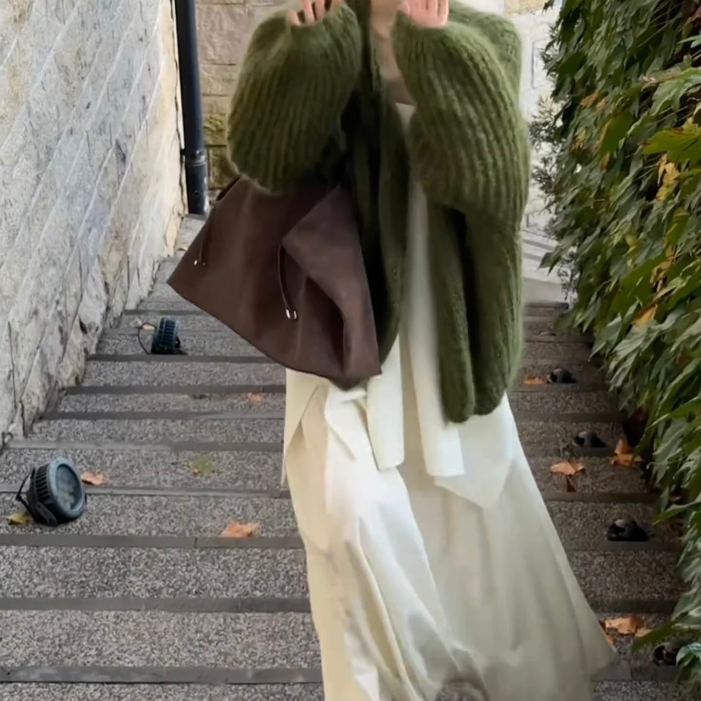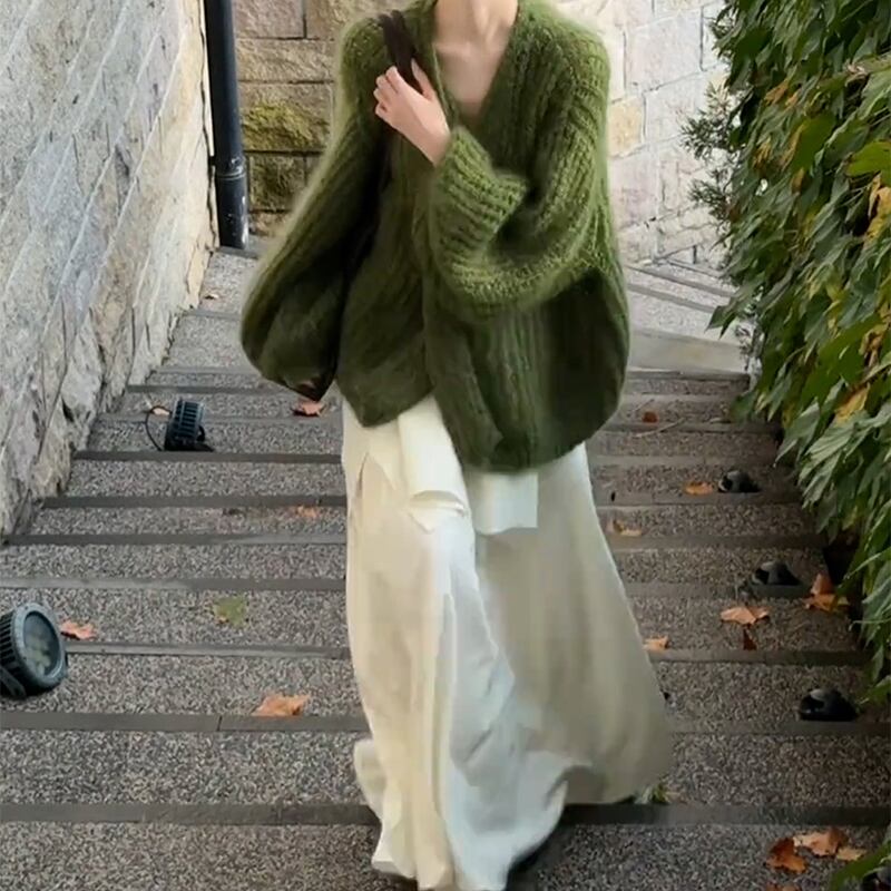 エレガントでフィット感抜群、リラックスした雰囲気も兼ね備えた韓国スタイルの女性用グリーンニットとスカートのコンプリートセットです。美しいグリーンが、あなたのスタイルを一層引き立てます。