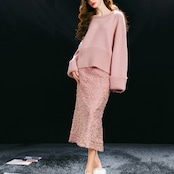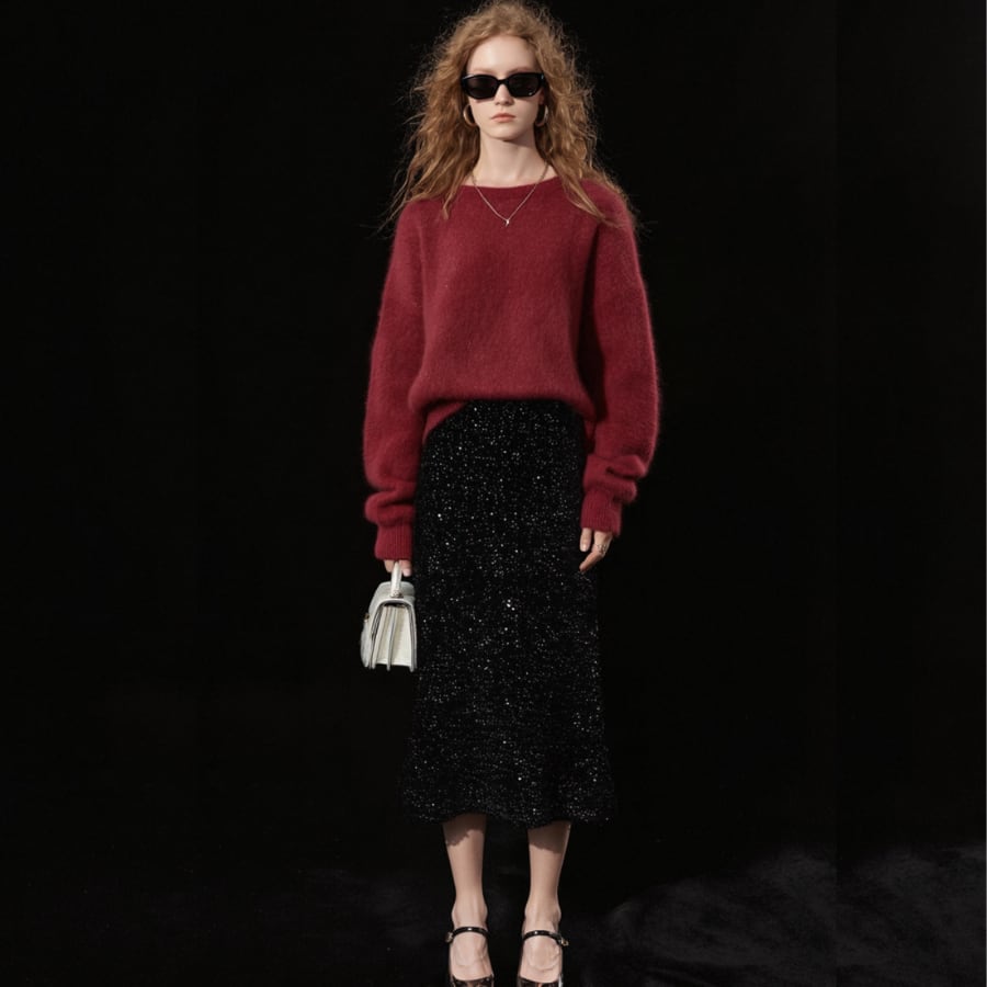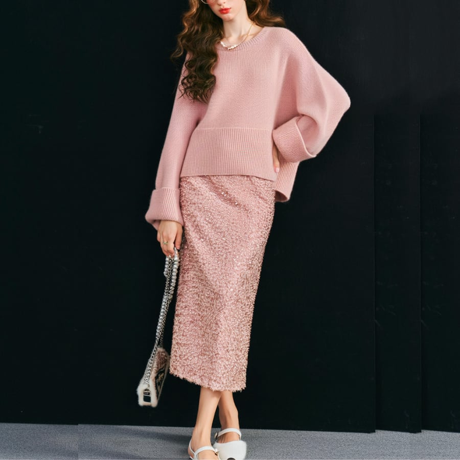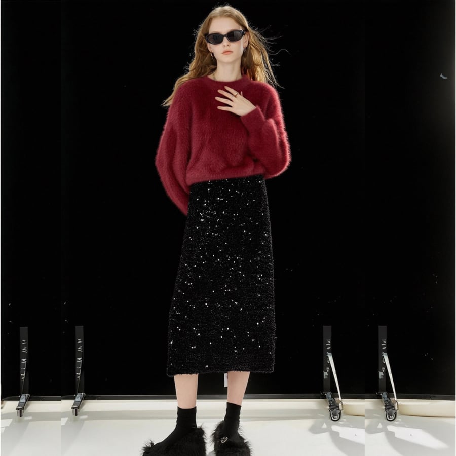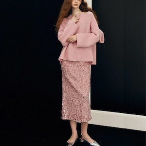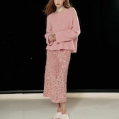 輝くスパンコールと洗練されたAラインデザインが特徴で、上品でありながらも、どこか特別感を演出します。このスカートは、カジュアルなコーディネートからパーティーシーンまで幅広く活躍すること間違いなしです!