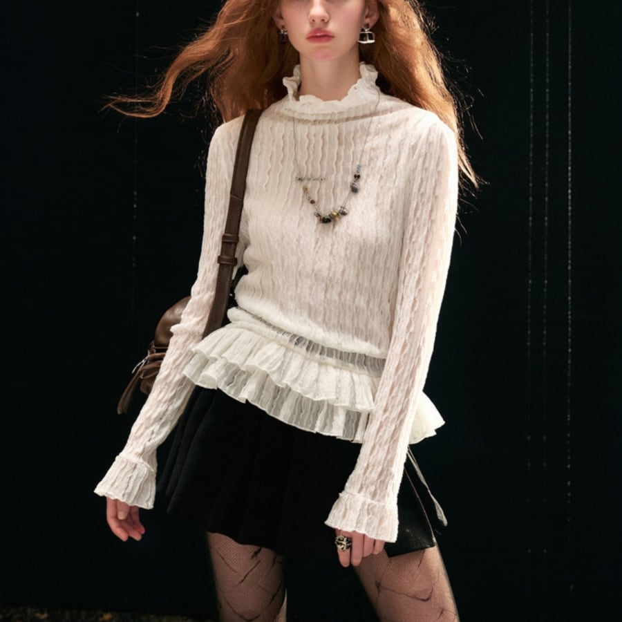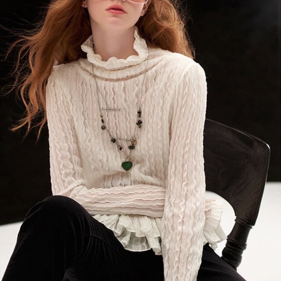 繊細なレースデザインとハイネックのスタイルが魅力で、上品さとカジュアルさを兼ね備えています。このTシャツは、デイリーユースはもちろん、特別なお出かけにも最適な一枚です!
