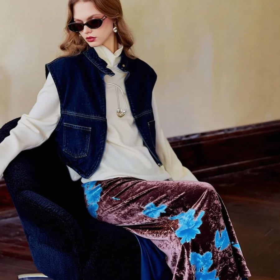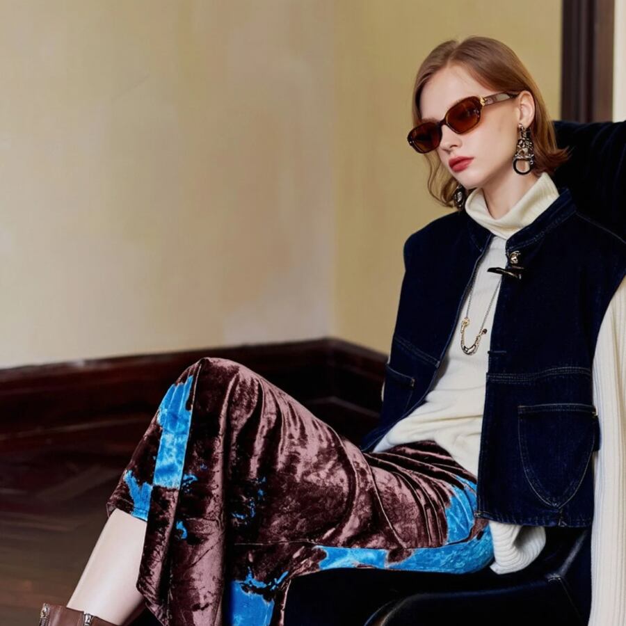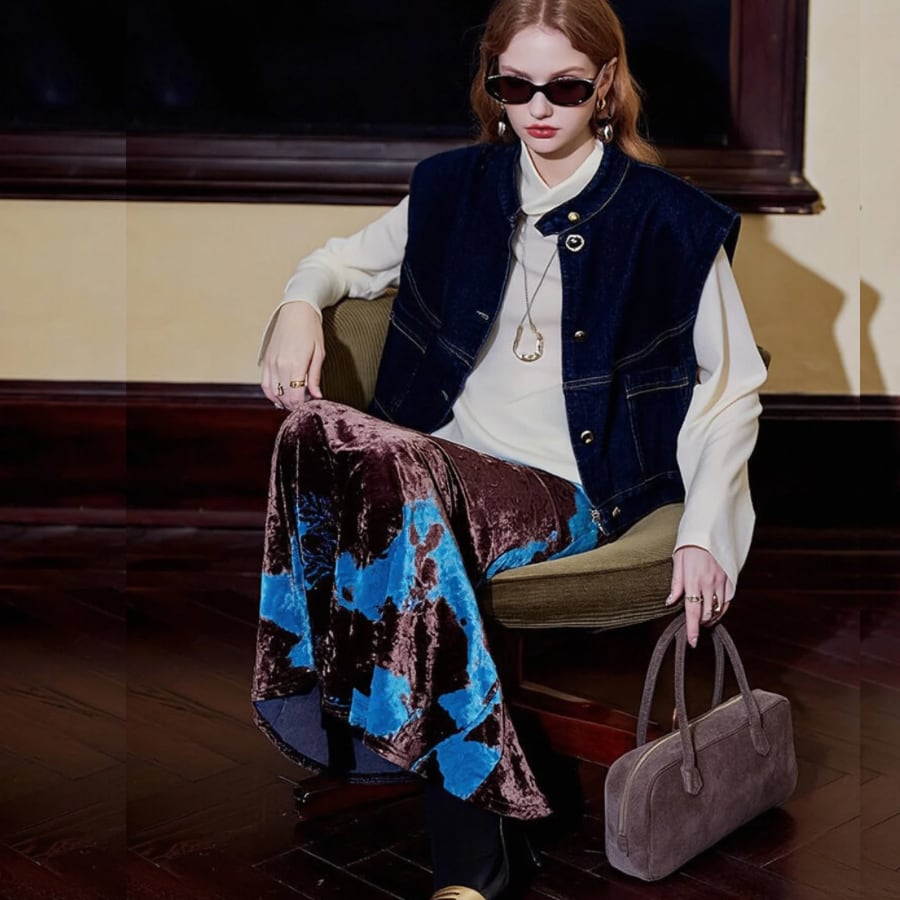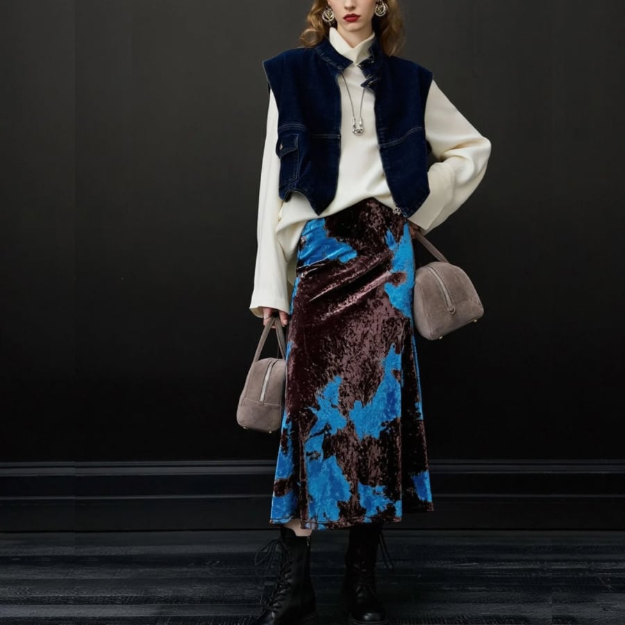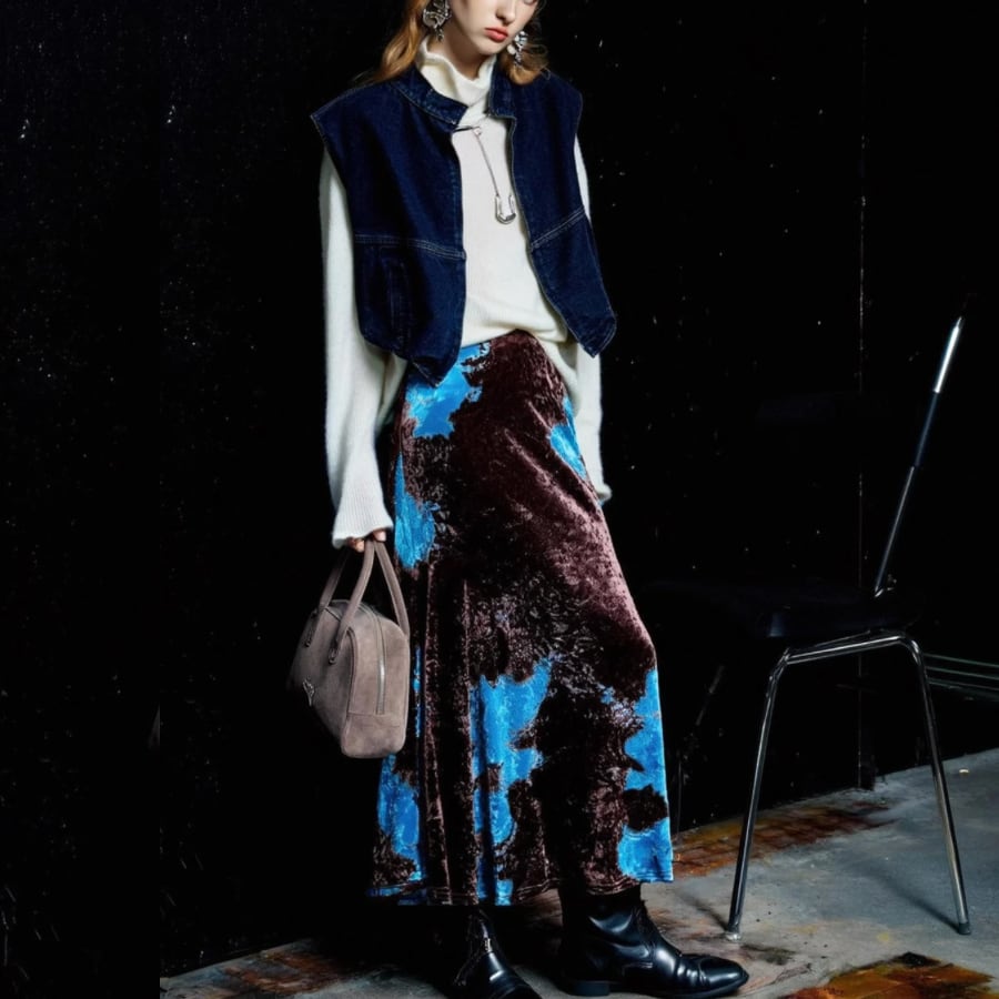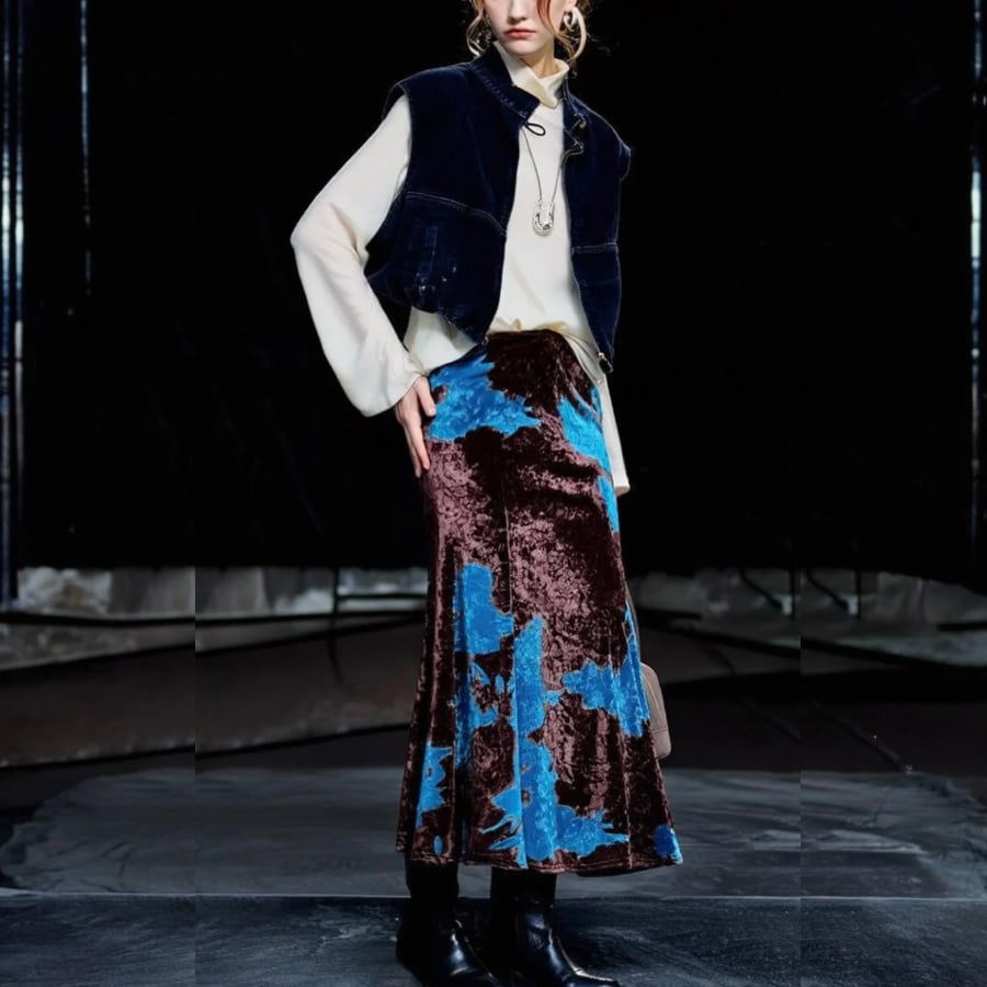 エレガントで洗練された印象を与えるエレガントベルベットハイウエストスカート。2025年秋冬新作のイレギュラープリント-インが、どんなシーンにも華やかさを添えます。