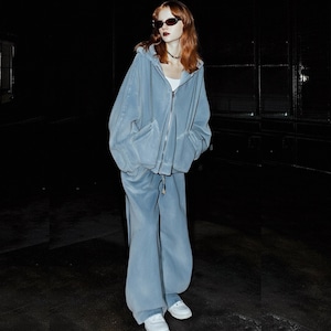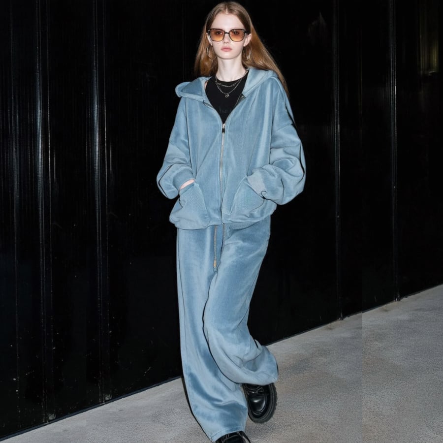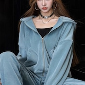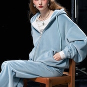 しっかりとしたベルベット素材が、肌に優しく触れる感触を実現。フード付きのデザインがカジュアルさとシンプルさを両立し、デイリースタイルにぴったりなアイテム。フロントのポケットも実用的で、スマートフォンや小物をしっかり収納できます。