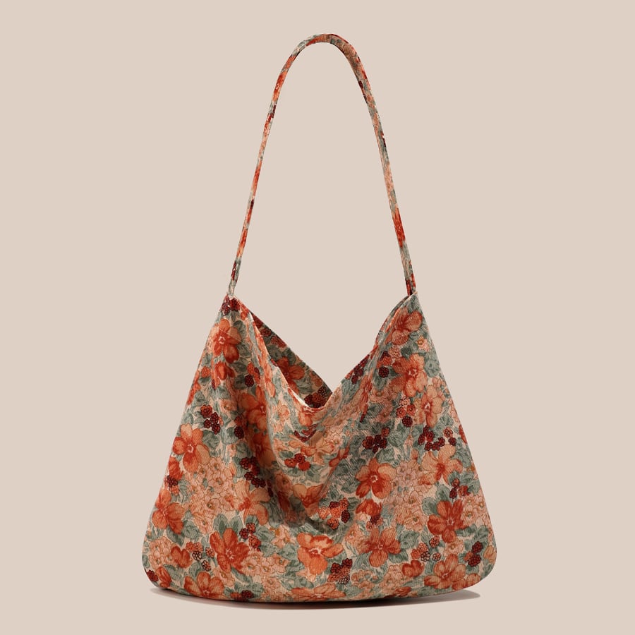 このバッグは、花柄デザインが特徴で、シンプルなコーディネートに華やかさをプラスしてくれます。大容量の収納力を備えており、通勤バッグとしてはもちろん、旅行やお出かけにもぴったりです。