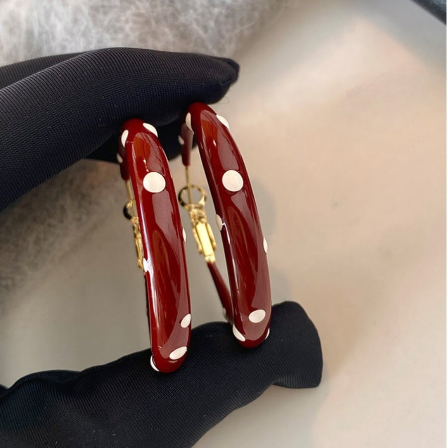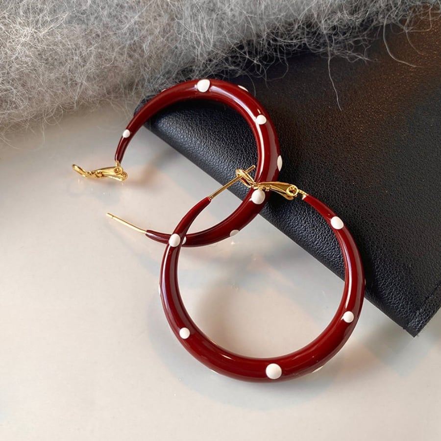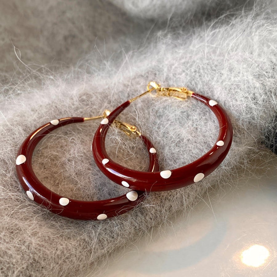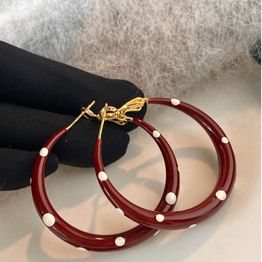 大胆なライトラグジュリーのラージフープデザインが、耳元で揺れ動き、どんなスタイルにも華やかさをプラス。レトロな水玉模様が程よいアクセントとなり、個性的でありながら日常使いにも最適です。