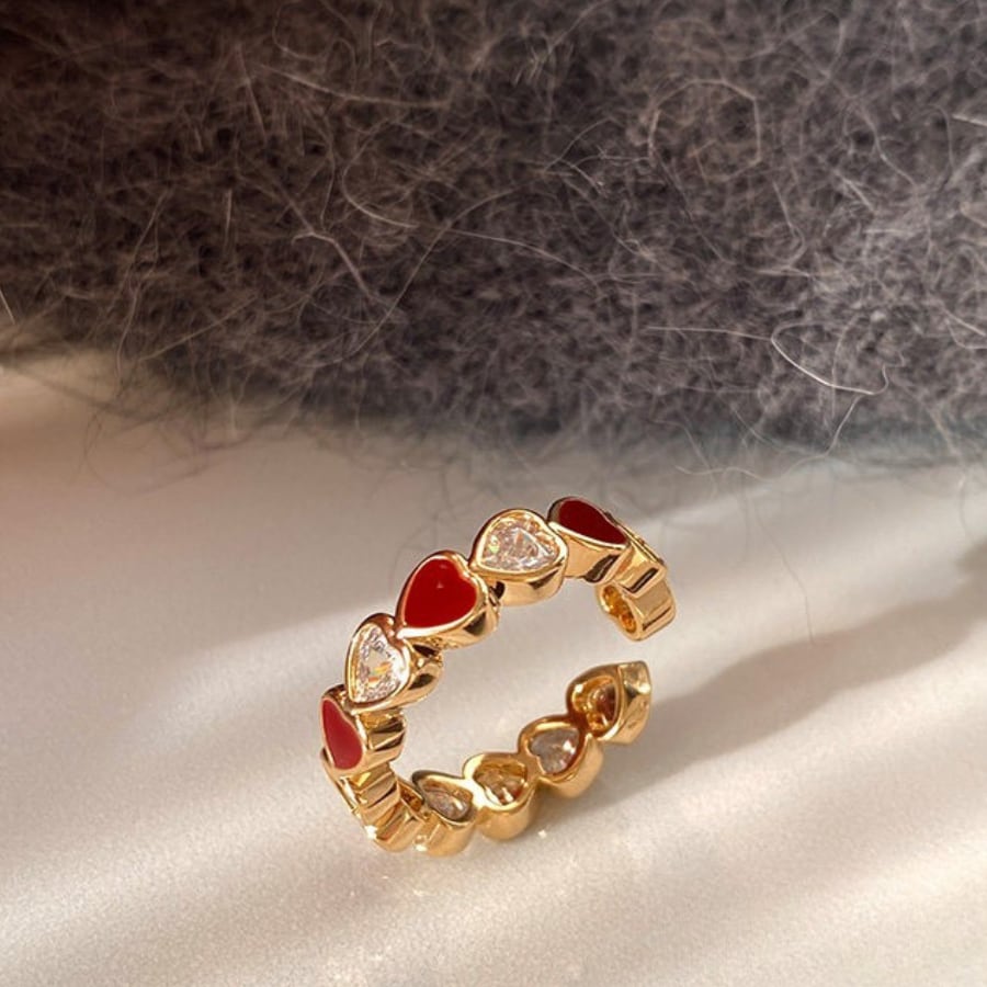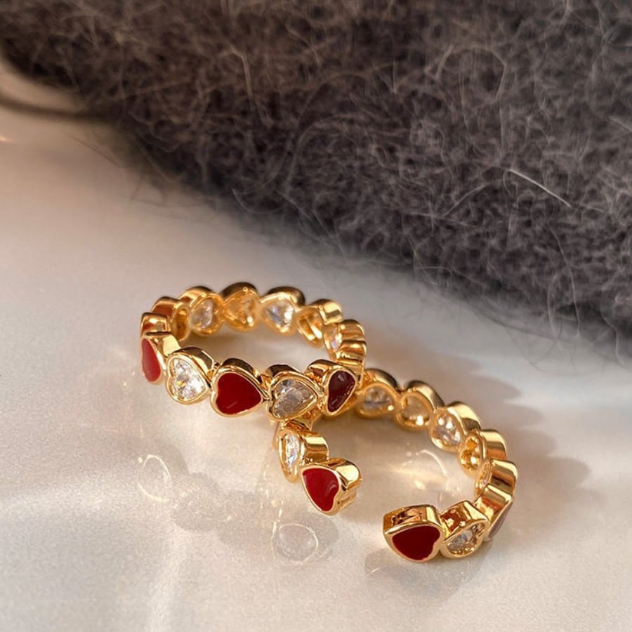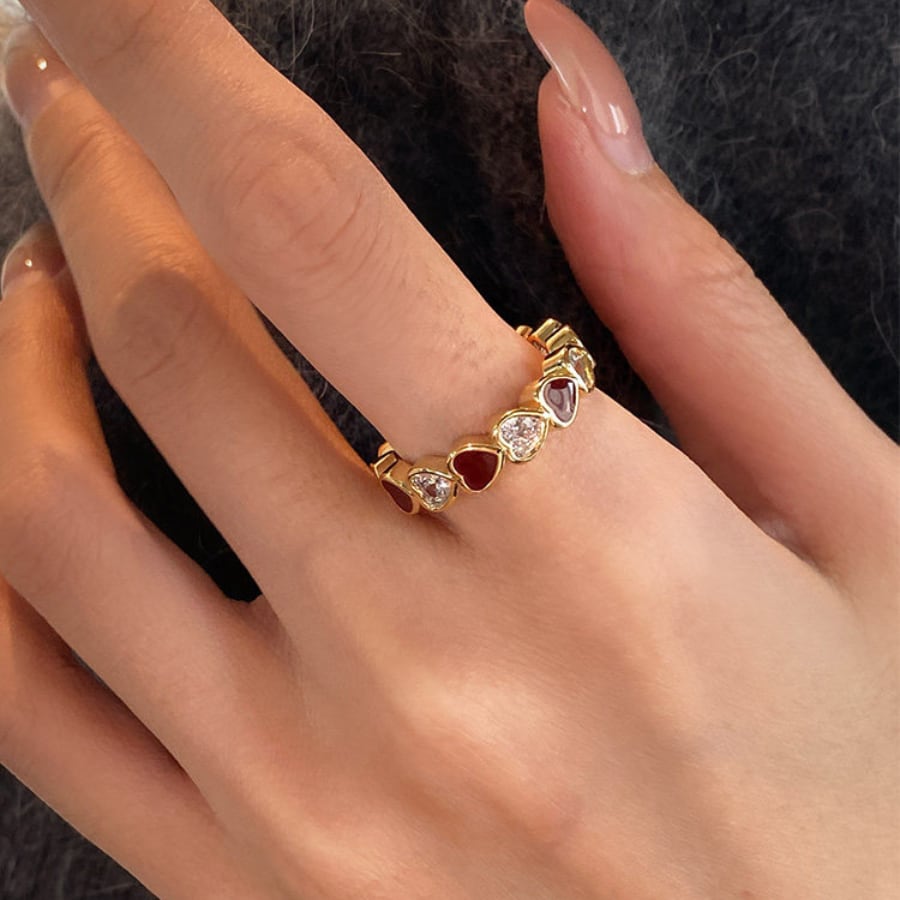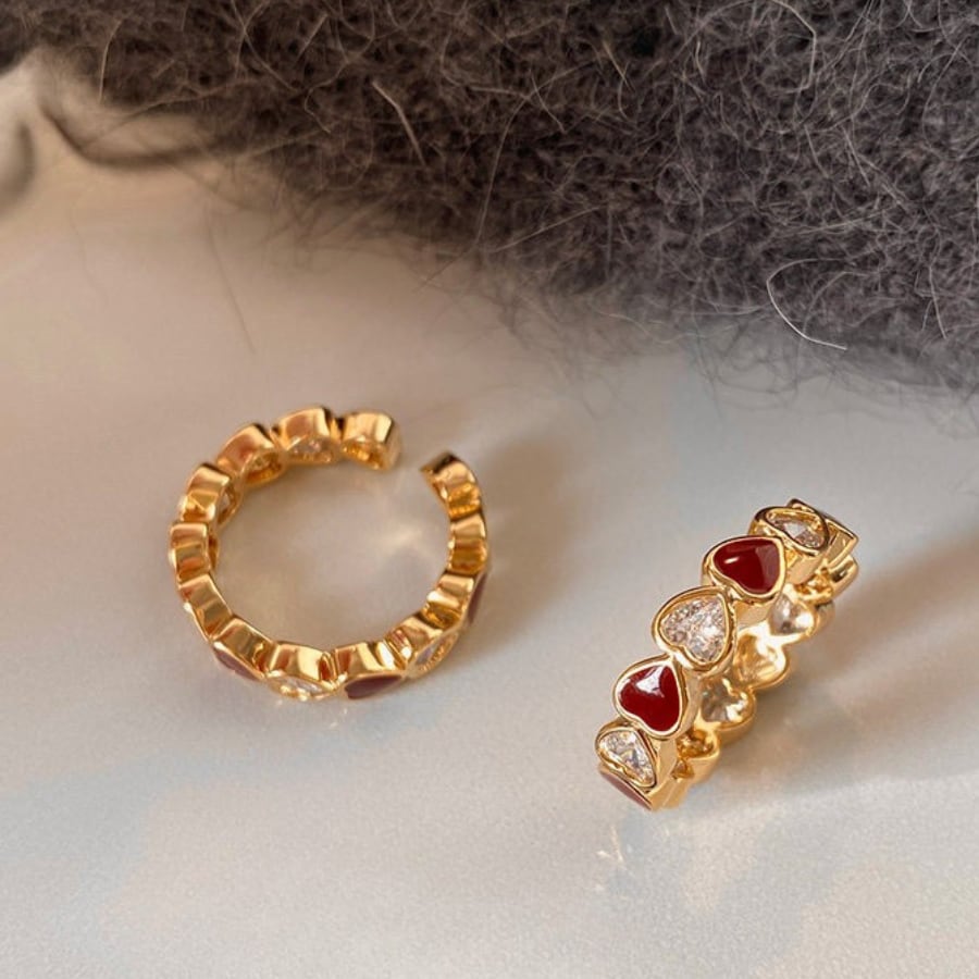 人目を引くバーガンディの色合いと、オイルドリップ処理が施されたジルコンの煌めきが、指先を美しく彩るオープンリングです。洗練されたデザインは、どんなスタイルにもさりげなく華やかさをプラスします。