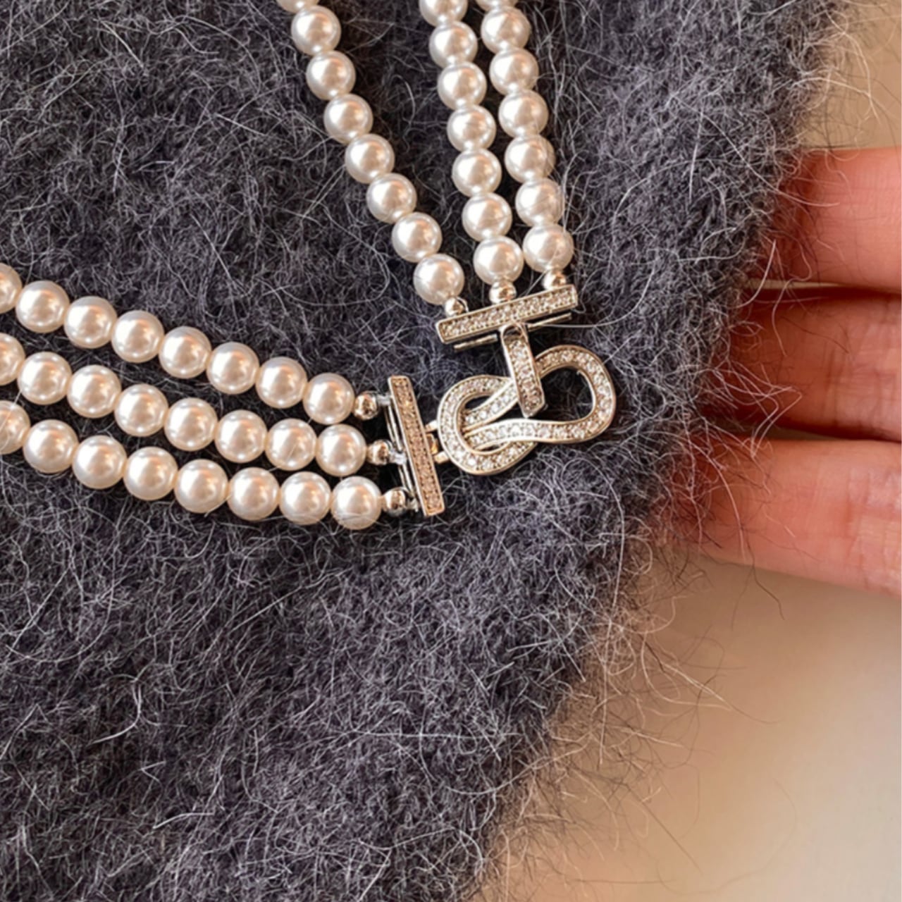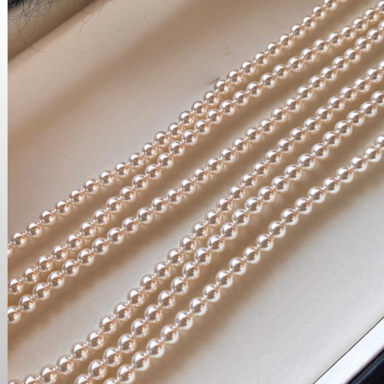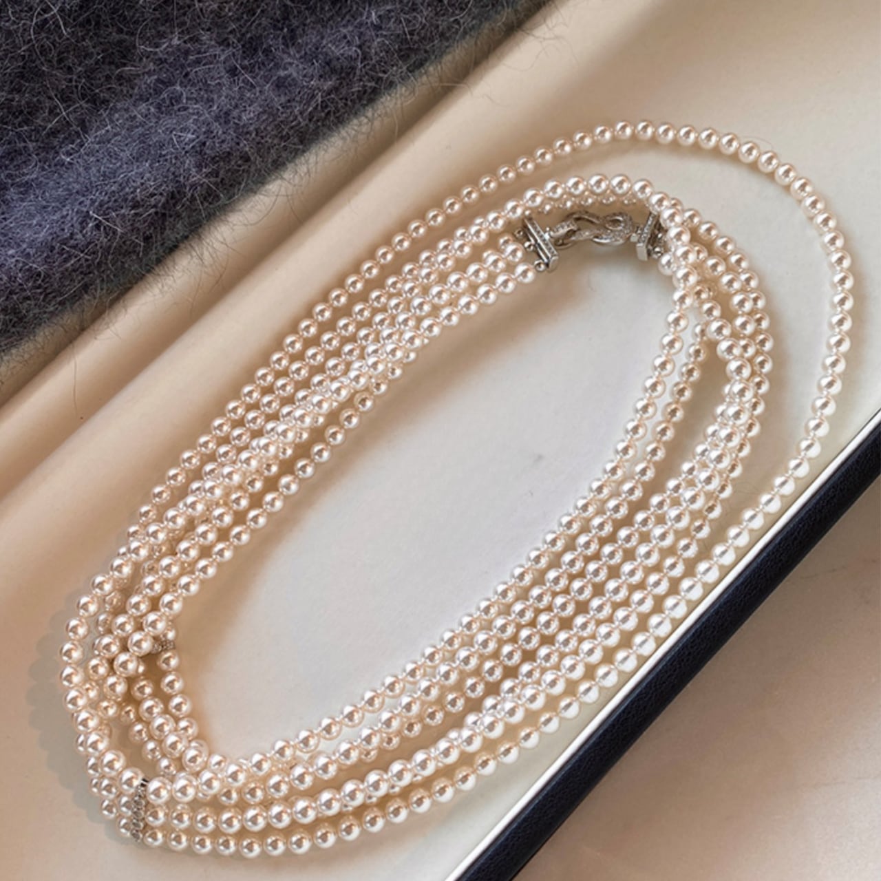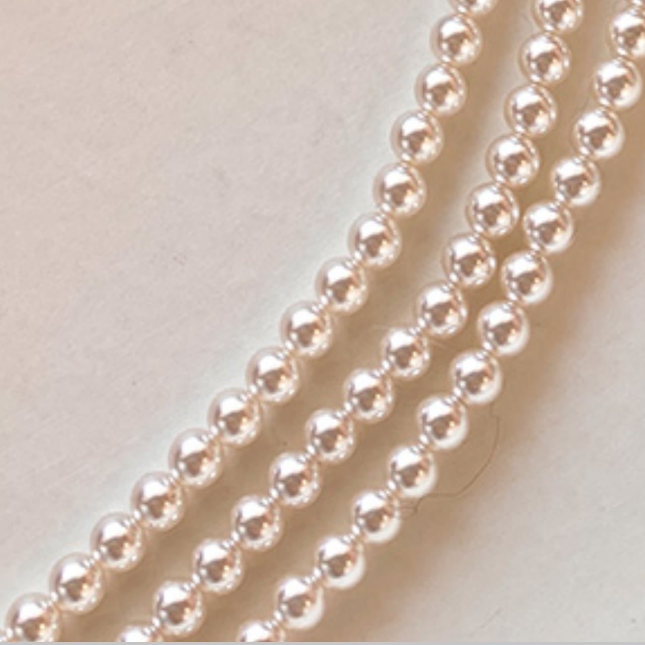 柔らかな光沢が美しい、3連ロングフェイクパールネックレス。