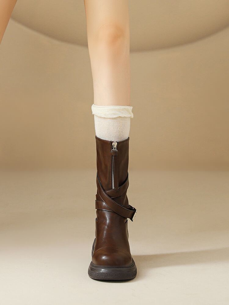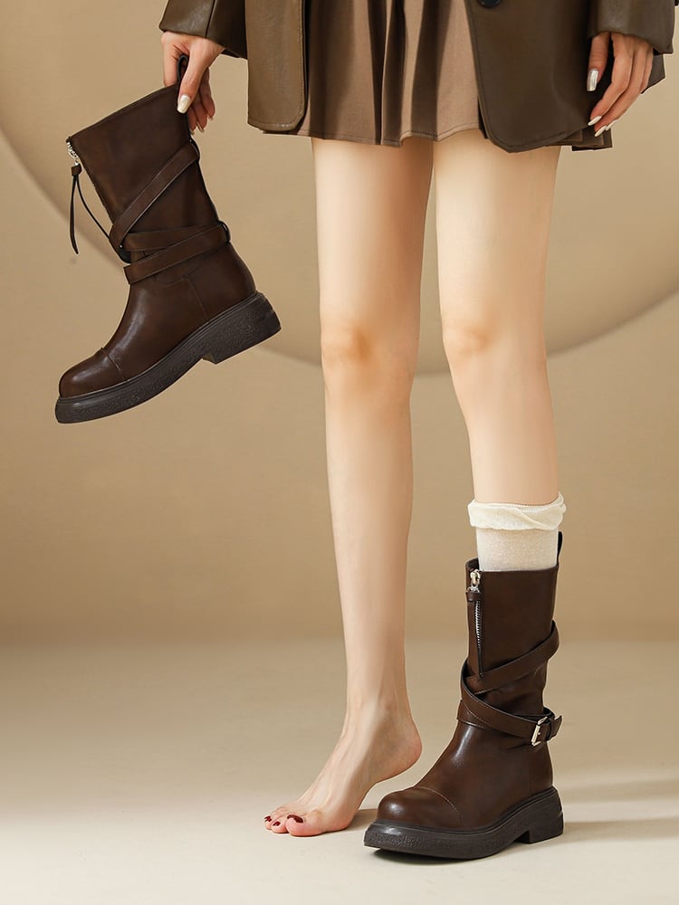 のレトロ感溢れるデザインが、このブーツの魅力です。厚底のデザインは歩きやすさを確保しながら、スタイルアップも叶えます。春から秋まで幅広くご利用可能で、どんなコーディネートにも合わせやすいブラウンカラー。