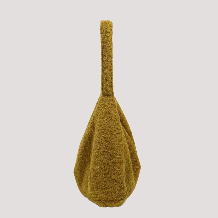 柔らかなフォルムと落ち着いたイエローカラーが、シンプルな装いにほどよいアクセントを添えます。
