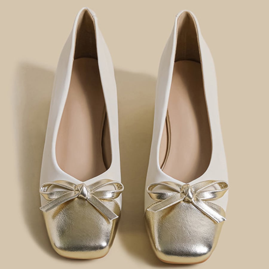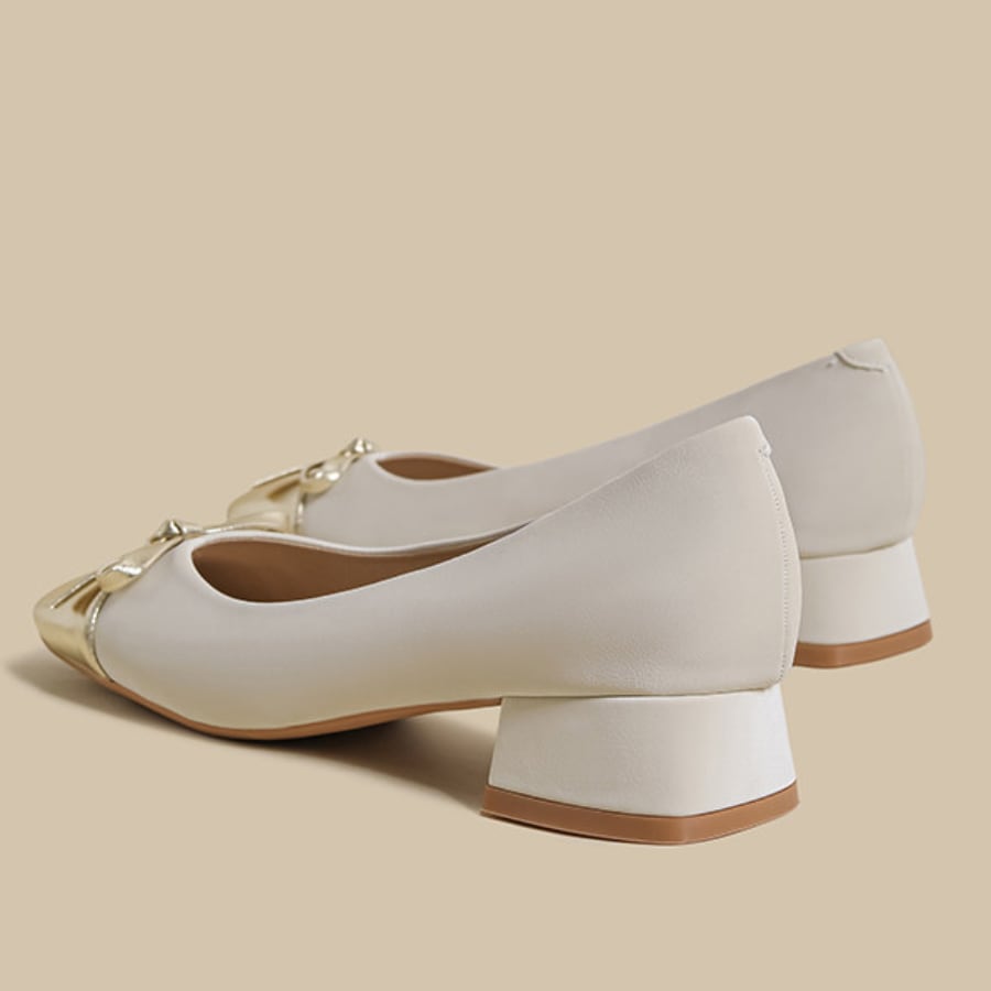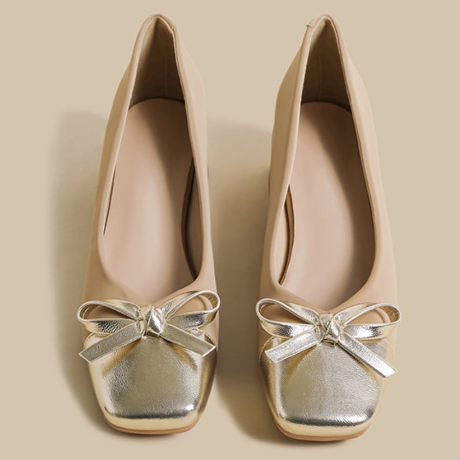 スクエアトゥのすっきりとしたシルエットに、さりげなく光沢感のあるリボンデザインが