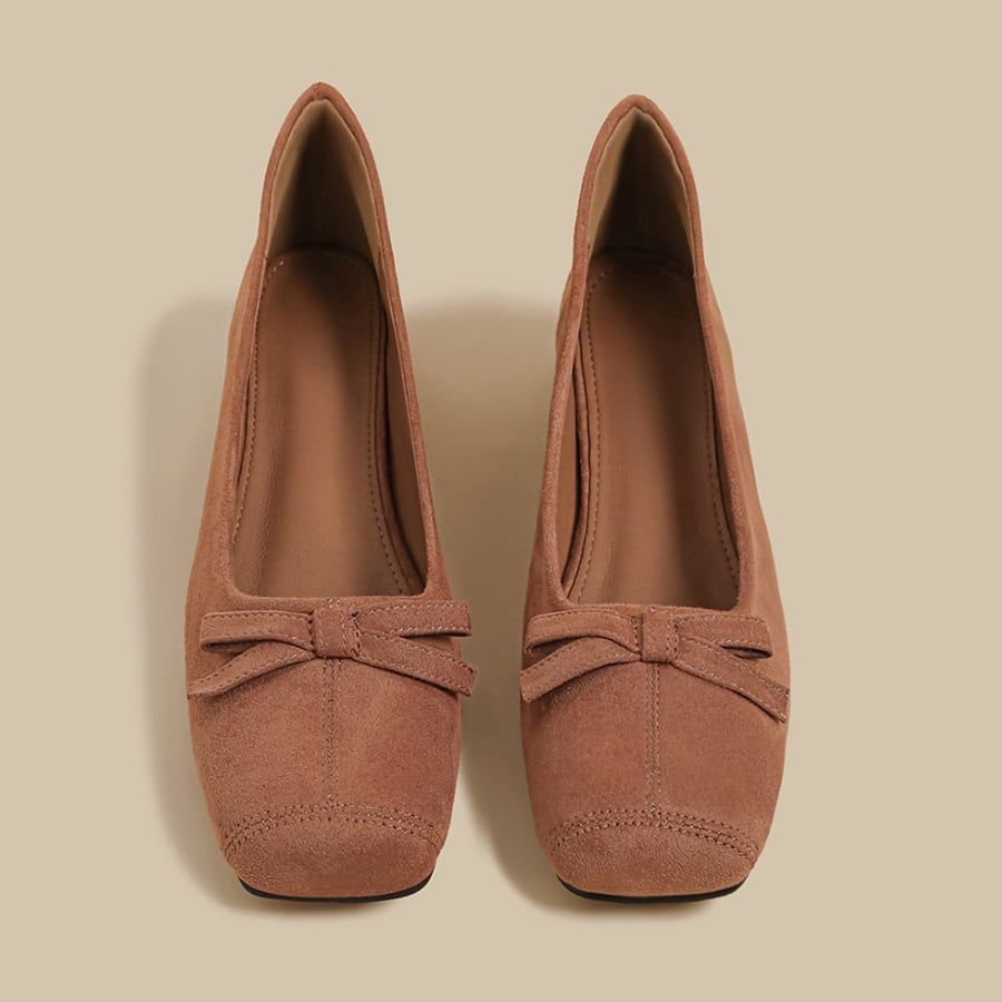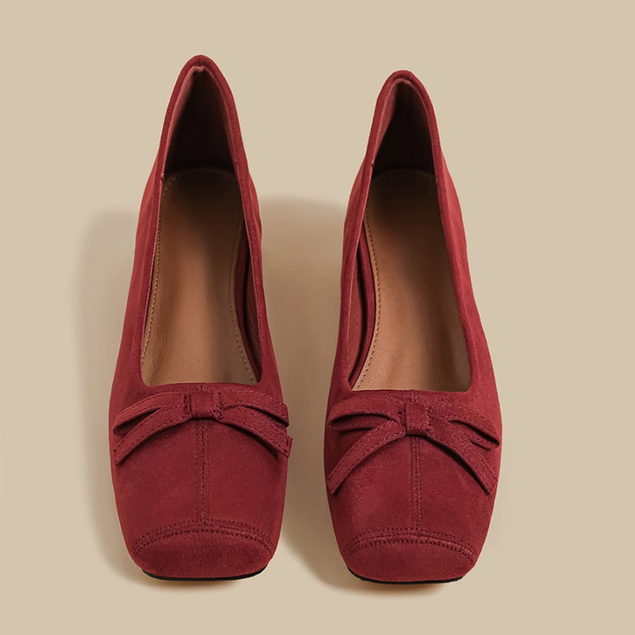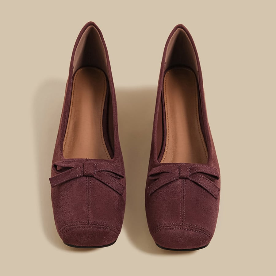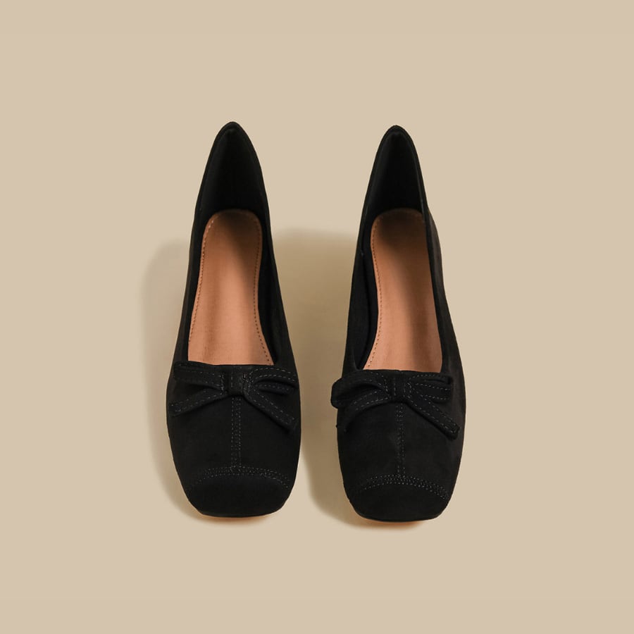 丸みのあるトゥと控えめなリボンモチーフが、甘くなりすぎない大人の可愛さを演出します。
