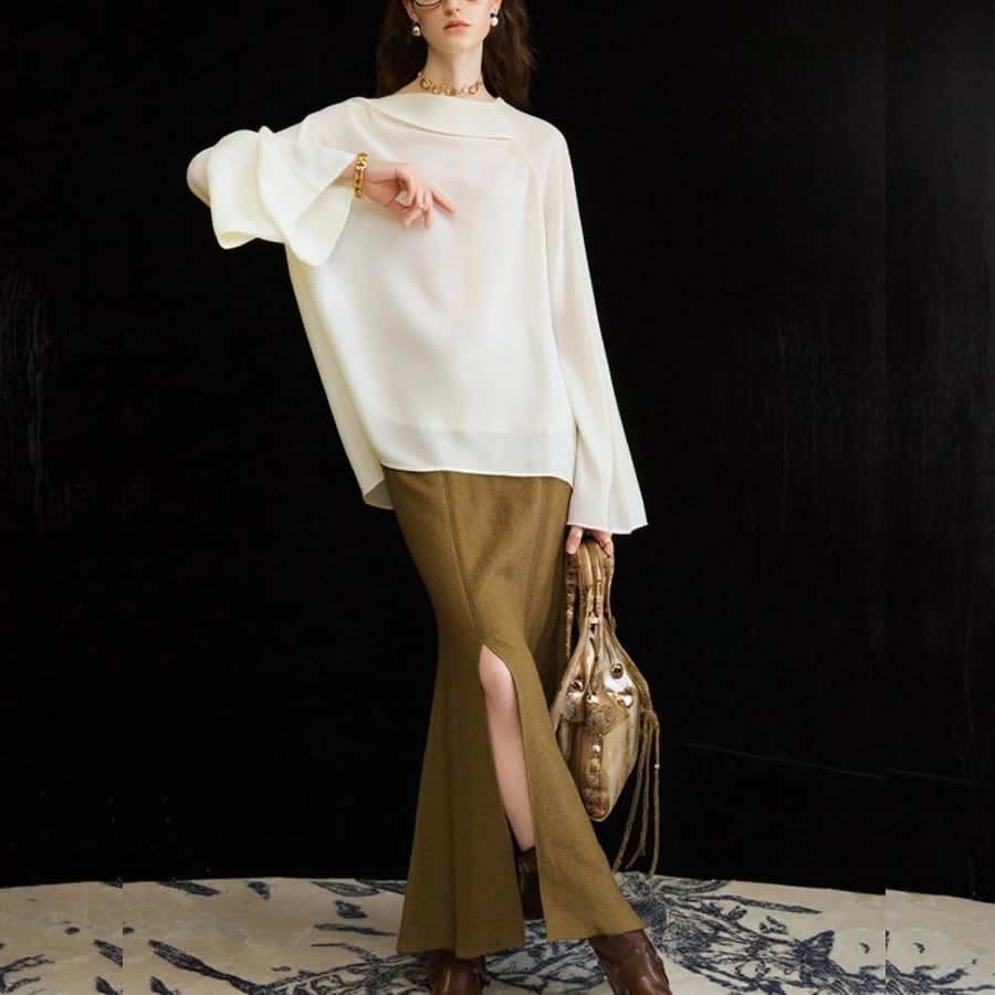 このシャツは、流れるようなドレープデザインとロングスリーブが特徴で、エレガントさを引き立てます。柔らかな素材感が心地よく、多様なシーンであなたの魅力を引き出します✨ シンプルでありながら高級感のあるデザインが、カジュアルな日常から特別なイベントまで幅広く活躍します。