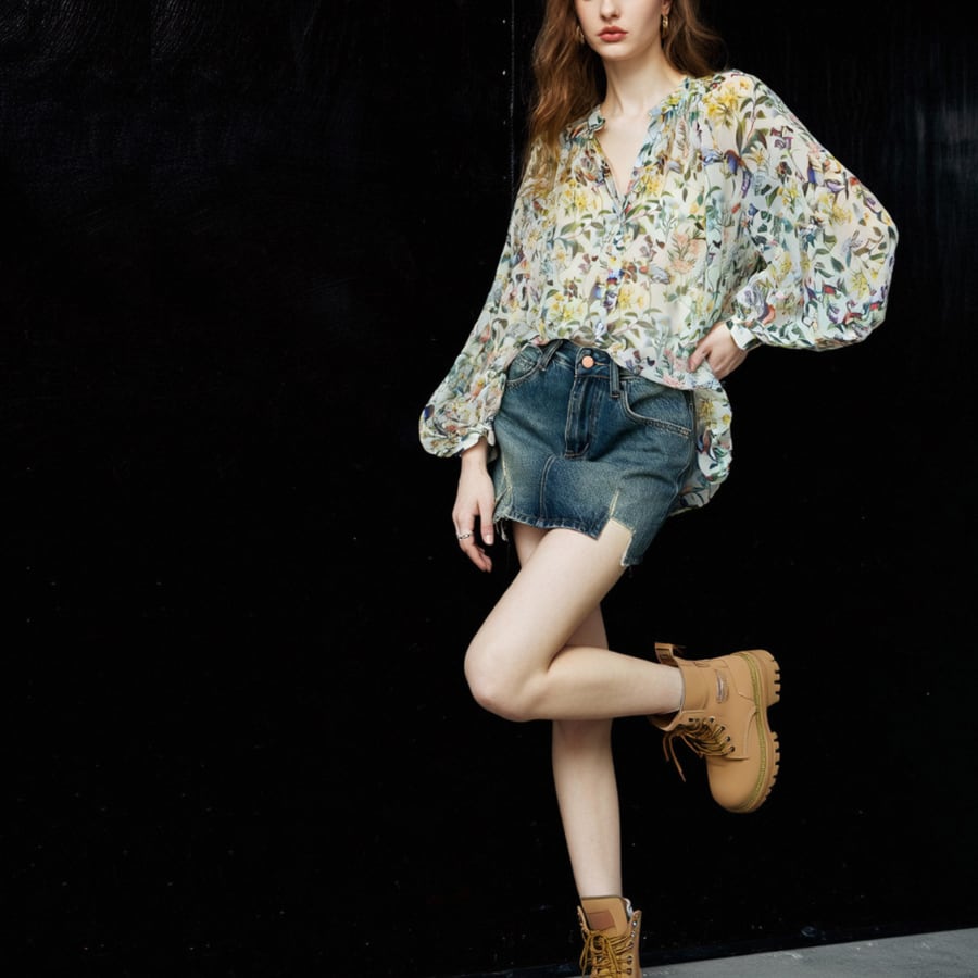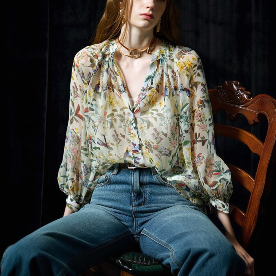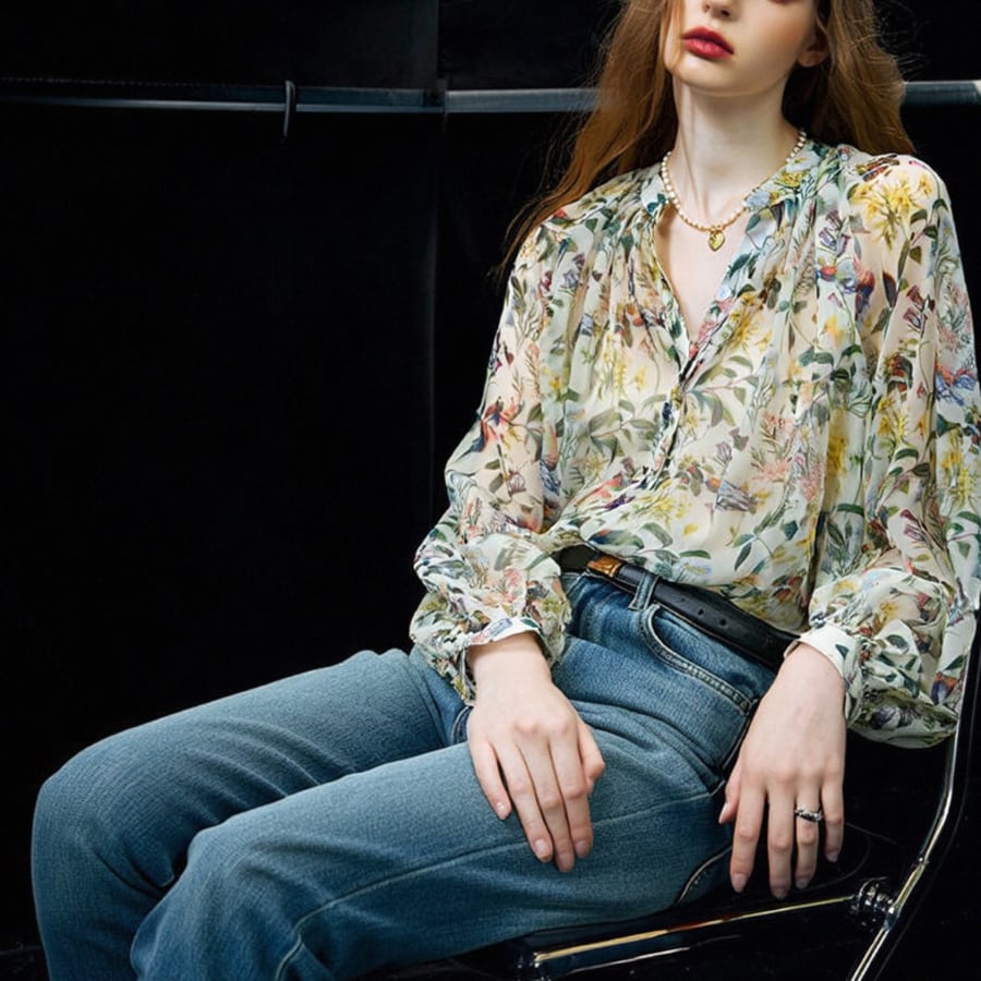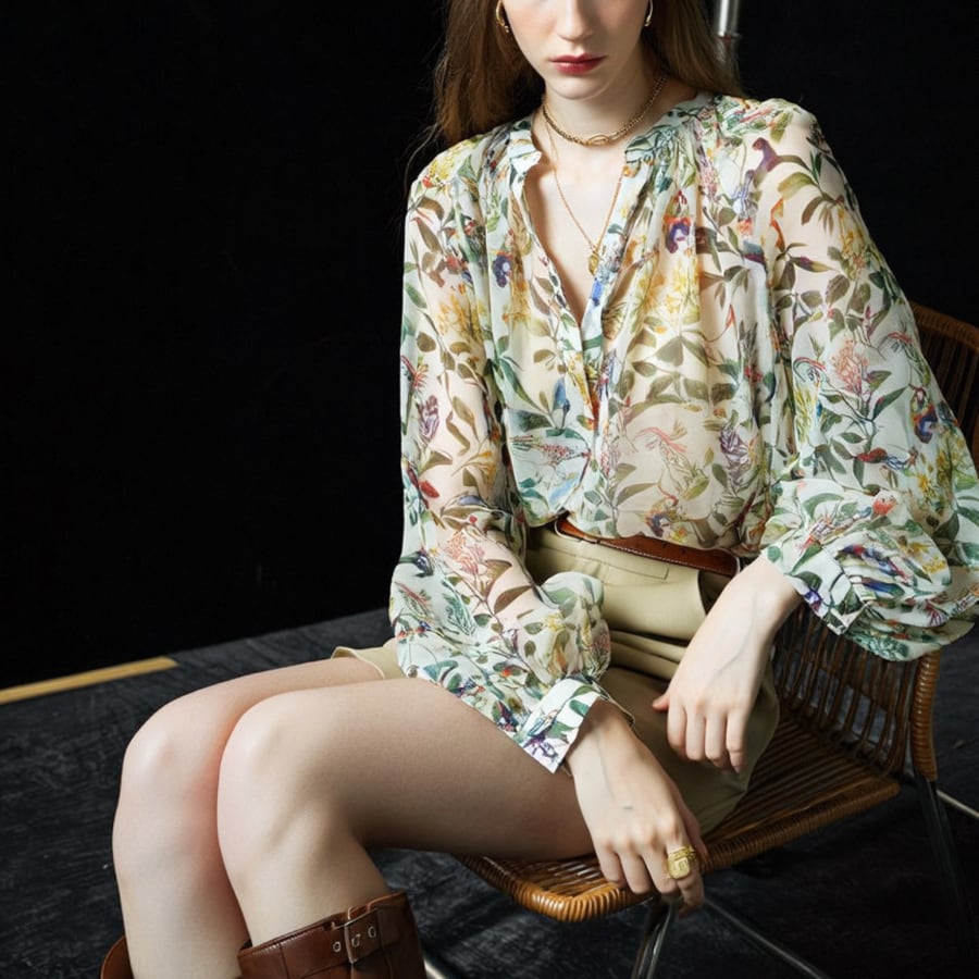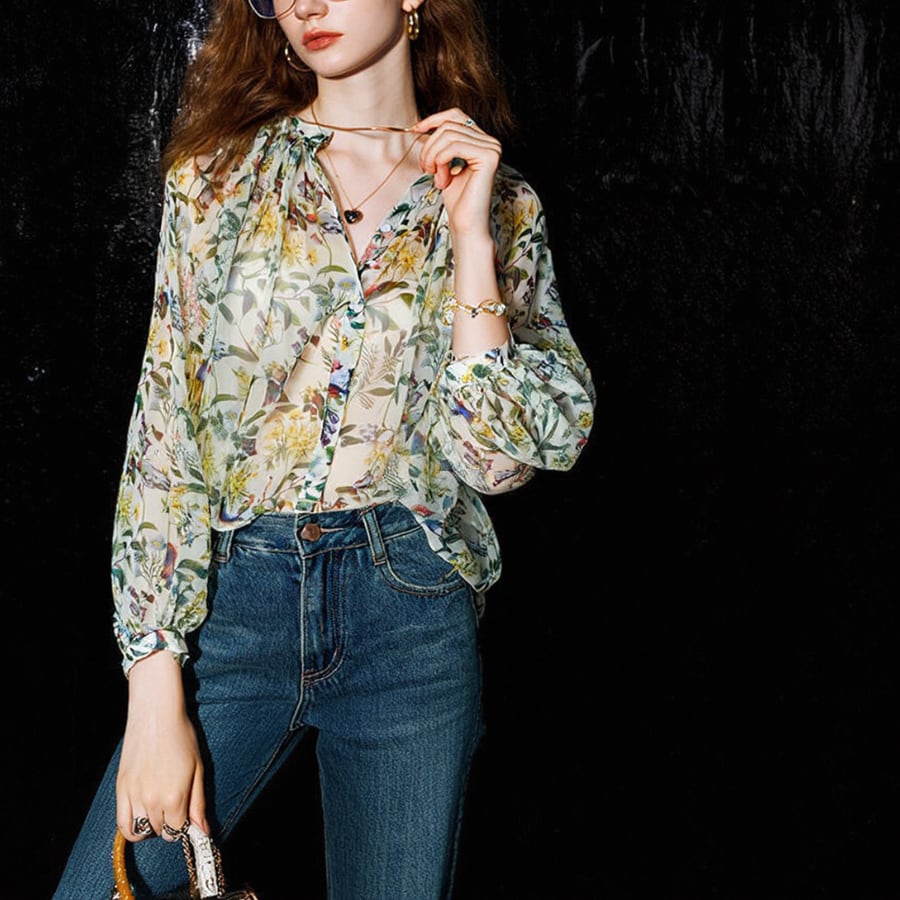 このシャツは、魅力的なフローラルデザインと軽やかなシフォン素材が特徴で、エレガントさとカジュアルな雰囲気を見事に融合させています。日焼け対策にも優れたこの商品は、春の暖かい日差しの下でも安心しておしゃれを楽しむことができます✨ 特別なお出かけやカジュアルなデイリーコーディネートにも最適な一着です。