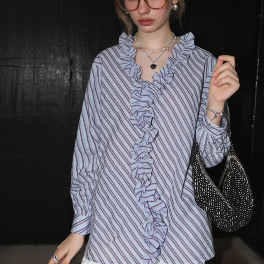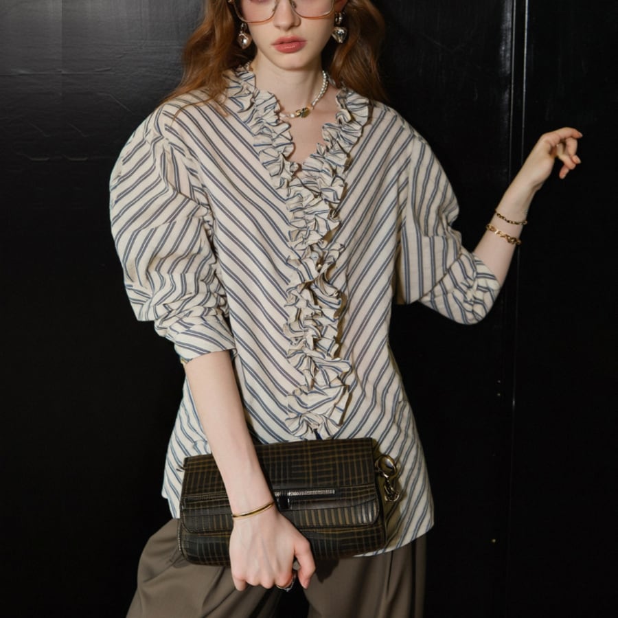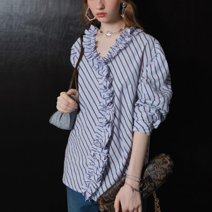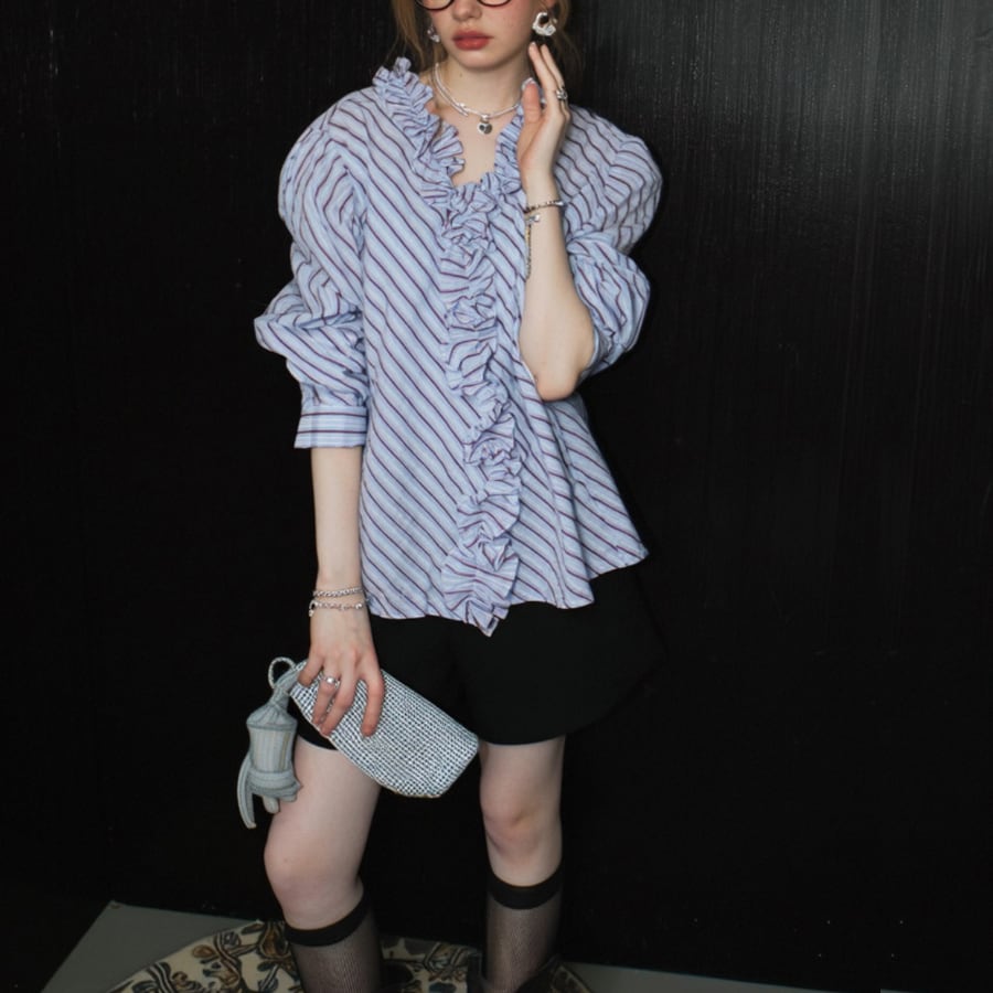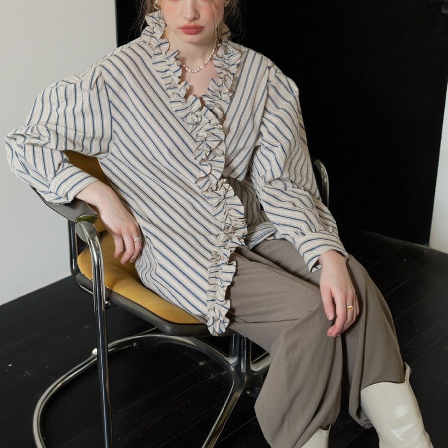 このフリルブラウスは、洗練されたストライプデザインが特徴で、カジュアルさとエレガンスを見事に融合させています。軽やかな素材感は、春の穏やかな日差しの中でも心地よく着用でき、どんなコーディネートにも合わせやすいのが魅力です✨ ラデイリースタイルはもちろん、おしゃれなオフィスコーデでも活躍する一着です。