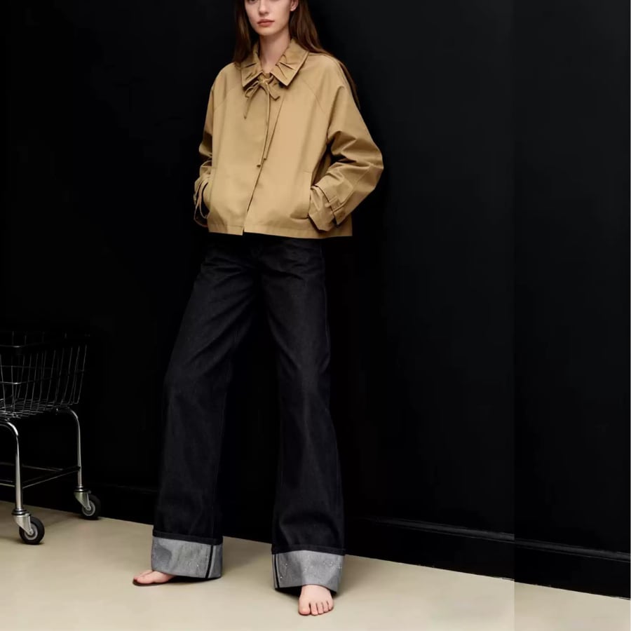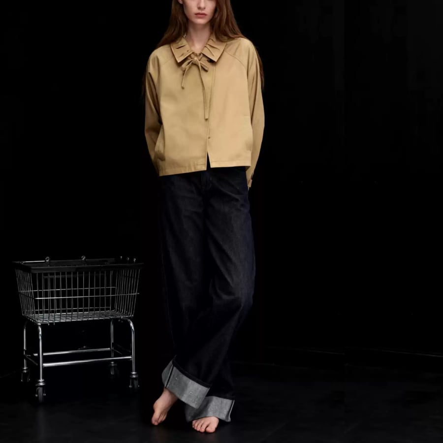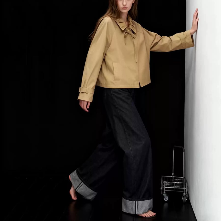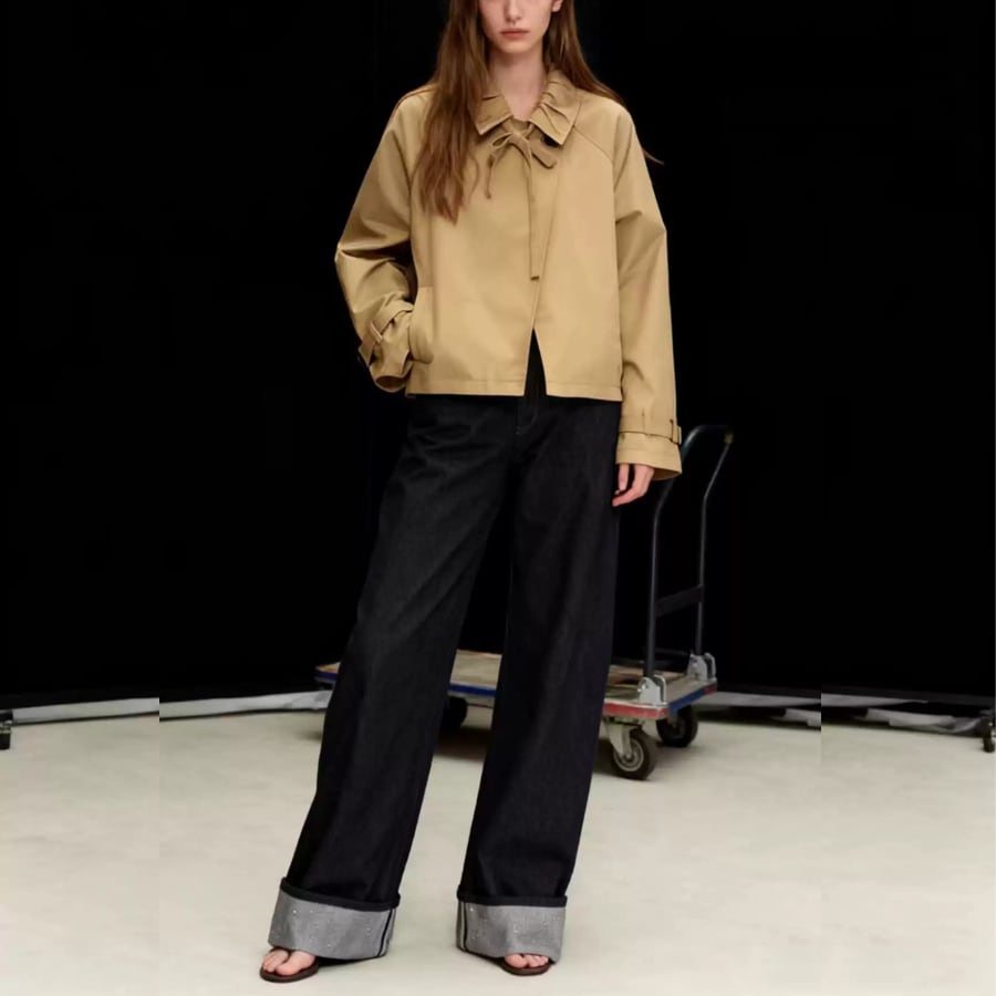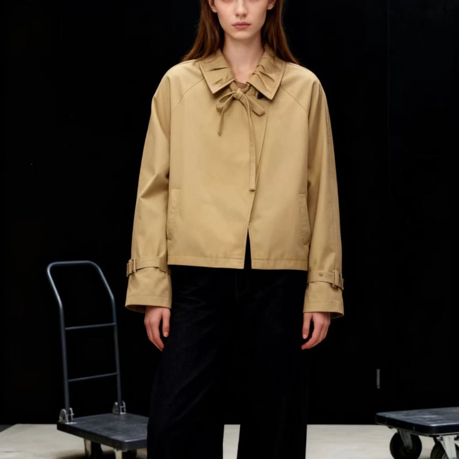 このショートジャケットは、ボウストラップデザインが特徴で、春、秋の季節にぴったりな一着です。柔らかな素材感とスタイリッシュなシルエットは、デイリーユースから特別な日まで幅広く活躍すること間違いありません✨ 快適さとおしゃれさを同時に楽しむことができます。