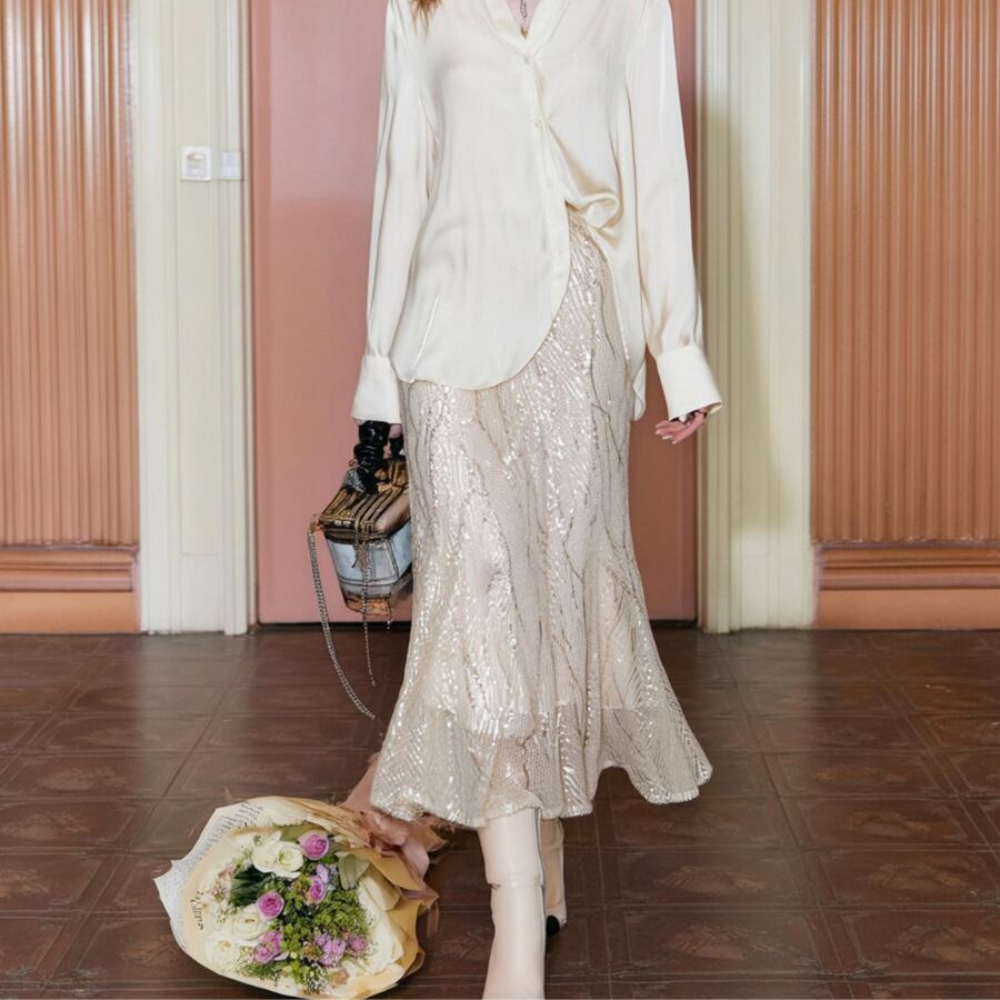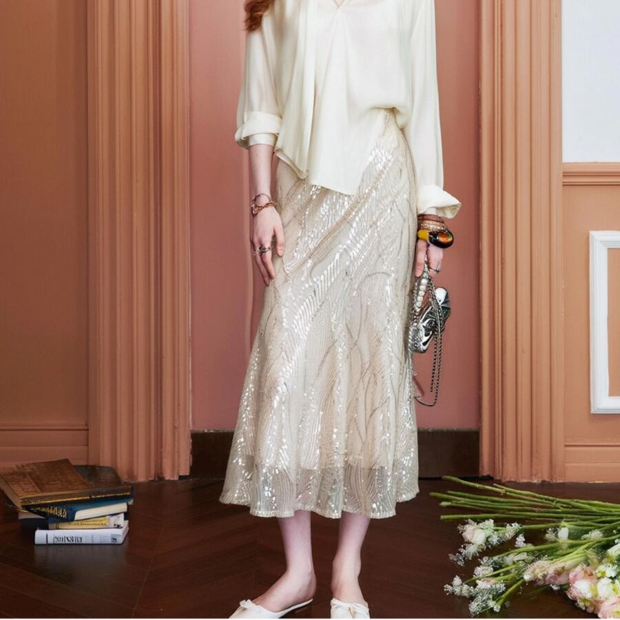 このスカートは、ラグジュアリーなデザインとスパンコールが魅力のアイテムで、特別な春のイベントにぴったりです!ハイウエストのフレアシルエットが女性らしさを引き立て、優雅なラインを演出します✨ このスカートがあれば、どんなシーンでも自信を持って着こなせること請け合いです!