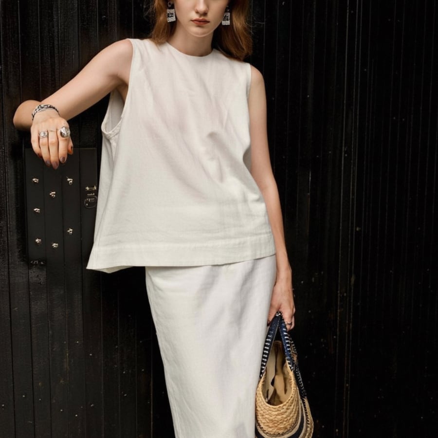 クルーネックのノースリーブトップスは、シンプルながらも品のある佇まいで、首元をすっきりと見せてくれます。