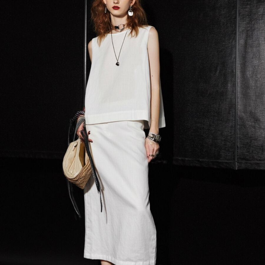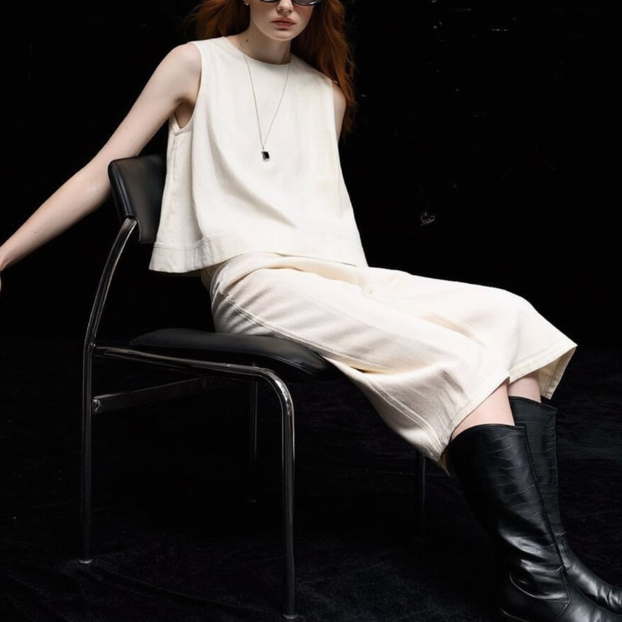 上質な素材を使用した、ノースリーブトップスとミディ丈スカートのセットアップ。