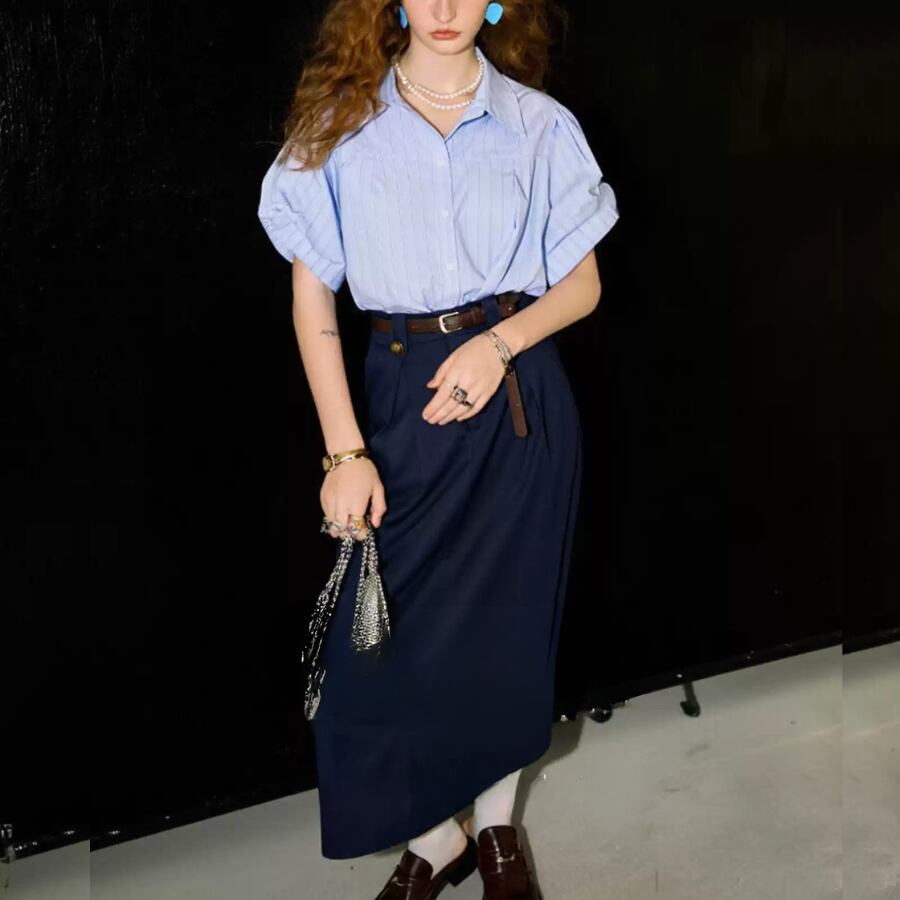 ストライプシャツとスカートの組み合わせで、